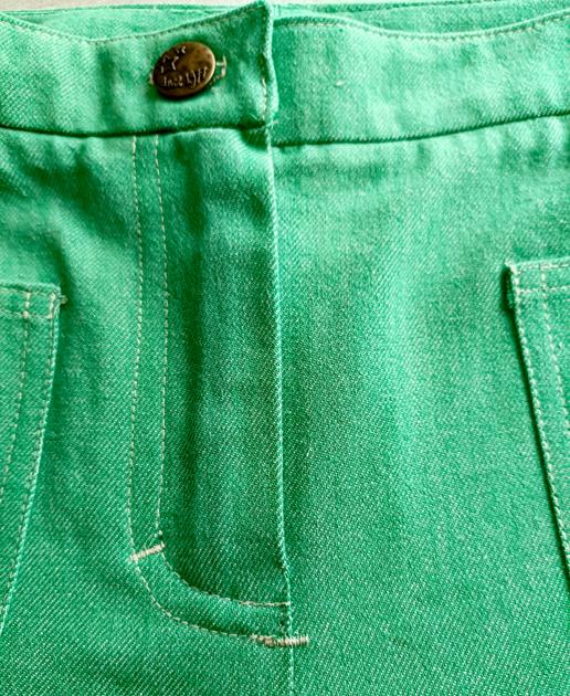 Ayant retrouvé un ancien coupon de jean vert pomme d'il y a au moins 25 ans j'ai testé sans modification le pantalon Walter de Sophie Denys jambes droites.