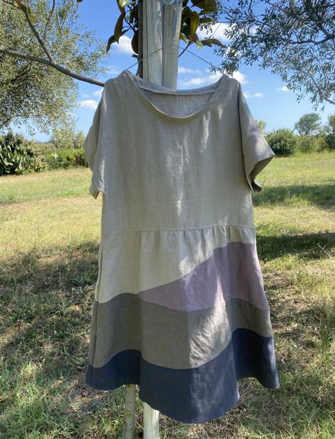 Inspiration "nature dress" (cf. insta / Pinterest) pour cette robe spéciale chutes de lin - coucher du soleil en Roussillon. Base patron de la robe dressed archi validé et déjà cousu 5 ou 6 fois (avec + 2cm de tour de bras). J'ai d'abord préparé mon gabarit de vagues pour la partie jupe, assemblé puis redécoupé les pièces devant et dos en miroir (contente des raccords, même les poches tombent pile sur une couleur chacune). L'encolure rebique un peu, à voir porté, mais je suis vraiment très contente du résultat !
