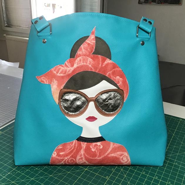 J’avais envie d’un projet amusant et coloré, et je suis tombée sur le patron de ce sac, Pretty Lady, de Shamballa Bags patterns (je ne connaissais pas). Vous choisissez les cheveux, les lunettes, les chapeaux, ….et vous créez votre tête. C’est rigolo. Je n’ai pas suivi tout à fait les instructions notamment pour le haut du sac où la créatrice propose de faire un repli de 1 cm pour le tissu extérieur et un repli de 1 cm sur la parmenture de la doublure, soit 4 épaisseurs de simili à piquer. Faisable, mais vraiment trop épais à mon sens. Dans mon élan, j’ai oublié de faire poche intérieure, je n’ai pas eu le courage de démonter….Pour les sangles, j’ai fait selon la méthode Sacotin, en bi matière. Ce sac, très girly, est un cadeau pour ma cousine. Je me vois bien le décliner en sac à dos, la forme s’y prette. J’avais tout en stock.