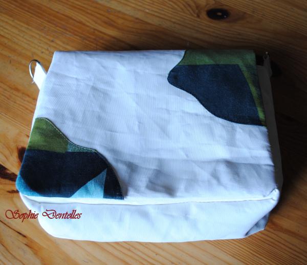 Pour un jeune homme qui a fait une traversée de l'Atlantique en catamaran, de la Colombie à l'Europe, avec plein de péripéties dont une voile déchirée. Il souhaitait garder un souvenir de cette traversée, avec une idée bien précise: un petit sac à porter en bandoulière cousu dans la fameuse voile, avec sur le rabat des appliqués dont il m'a dessiné la forme dans un tissu choisi par lui. Sous le rabat le demi-logo du fabricant de la voile, il devait être au dos mais un moment d'inattention est vite arrivé.