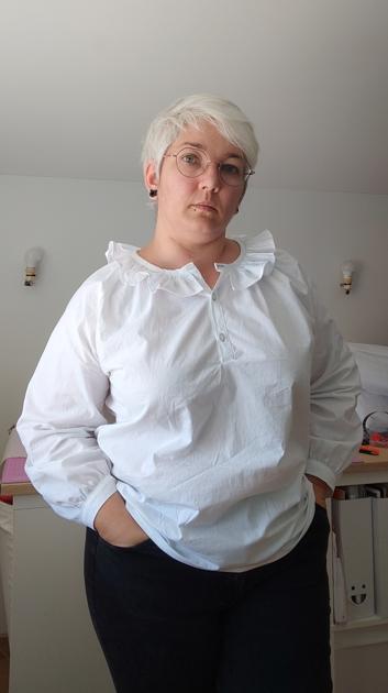 Bravo pour cette belle réalisation ! Même si je ne suis pas fan des petits volants je reconnais que cette chemise est jolie et te va fort bien. 👏