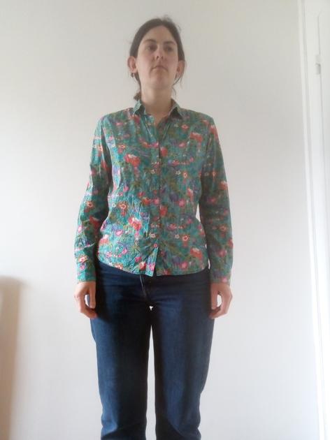 Hormis que j'aurais dû m'écouter et faire mes manches plus serrées de 2-3 cm et moins longues de 2 cm, la chemise tombe mieux que la précédente, ce tissu se tenant mieux que le lin de la première version. Malgré la grande différence au porté entre les deux modèles, il n'y a aucune différence de taille sur les pièces de patron utilisées.