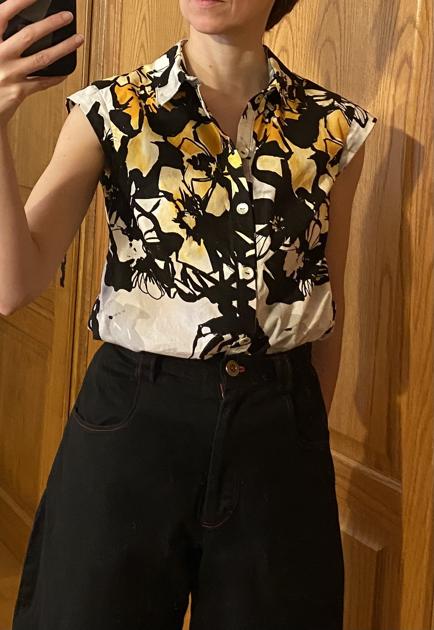 j’ai jeté mon dévolu sur une belle chute de popeline, facile à coudre. Pas assez de tissu pour faire les manches et le dos en une seule pièce mais les premiers ajustements me semblent corrects. Et les mancherons seront parfaits pour la belle saison et l’imprimé floral. L’entoilage en stock pour les pattes de boutonnage est un peu raide malheureusement.