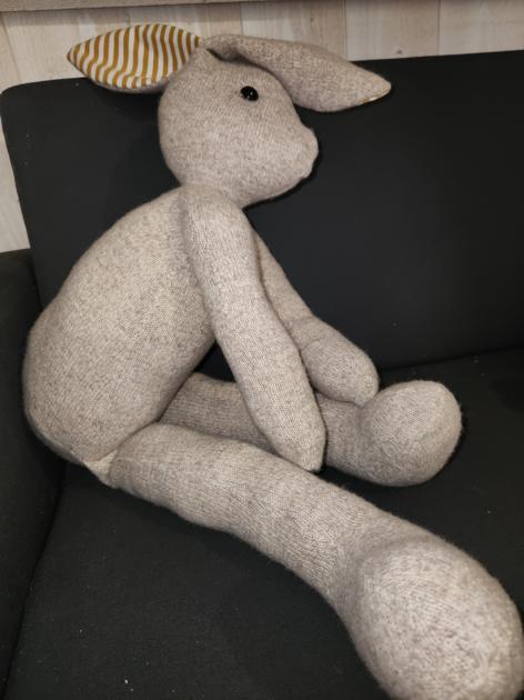 J'ai pris un grand plaisir à coudre Mme Flora, grand lapin de 60 cm environ. Pour le tissus du corps j'ai choisi un tricot peu extensible de mon stock avec une belle tenue. Le patron est très bien expliqué, en anglais, mais les instructions sont très claires agrémentées de schémas à chaque étape. Il m'a fallu 2H pour réaliser le corps complet. J'ai utilisé un jersey différent pour l'intérieur des oreilles. La construction est très bien pensée, notamment pour le torse en forme de pyramide, et qui s'emboîte dans la base de la tête. Les bras et pates sont cousues au buste avec un fil robuste, les yeux sont des boutons boule, mais on peut également les broder. La créatrice propose plusieurs formules : le patron en PDF ou format papier, le kit avec les fournitures, les habits seuls en kit ou le patron en PDF ou format papier. J'ai choisi de lui confectionner ce qu'elle nomme la "robe patineuse", mais il semble qu'elle a été conçue pour le modèle Luna, plus petit, car elle est trop petite pour Flora. Pas grave, elle sert de blouse et j'ai cousu une jupe en velours ras de mon stock. La robe est plus compliquée, car elle est composée de panneaux latéraux coupés dans le biais et les 2 pièces qui forment le devant sont croisées et fermées par un double boutonnage. Là en revanche, j'ai trouvé les schémas peu explicites, et j'ai même dû envoyer un message à la créatrice car j'étais un peu bloquée à l'étape 6-7. J'ai choisi un liberty dans mon stock depuis très longtemps, et j'ai renoncé aux boutonnières pour privilégier les pressions. Le lapin est très expressif, et j'ai pu constater qu'il plaît autant aux enfants qu'aux personnes très âgées qui l'ont tout de suite adopté à la maison de retraite. J'ai l'intention de réaliser M. Flora vêtu d'un pantalon en velours et d'un duffle coat du même velours que celui de la jupe, et j'ai également fait l'acquisition de l'ours Bramble. Je pense que toute cette ménagerie sera du plus bel effet pour la Noël, d'autant que la réalisation est très rapide.