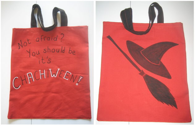 2014 : tote bag Halloween pour une amie née fin octobre (surnom Chachi), tout simple avec des chutes de tissus demi-nate et peinture acrylique. Pas de doublure.