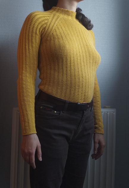 Par contre, je suis moins sûre du jaune. Il est moins moutarde que ce à quoi je m'attendais, mais joli quand même mais je crois que ça ne me va pas au teint... Tant pis, je le porte quand même parce qu'il est bien agréable. Faudrait que je me penche sur ces histoires de colorimétrie un jour.