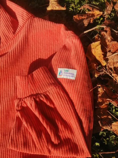 Tissu : Jersey en velours côtelé biologique de chez Cousubio, coloris Copper, de laize 165 x 130, c'était ric rac. Etiquette Marmaï.