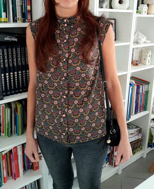 Et puis j'avais ce tissu Liberty Persephone vert idéal pour l’automne et que je gardais précieusement pour pouvoir me faire un haut. J'avais juste assez de tissu (1 m) pour faire la version avec mancherons pour changer des chemises à manches courses/longues que j’ai.