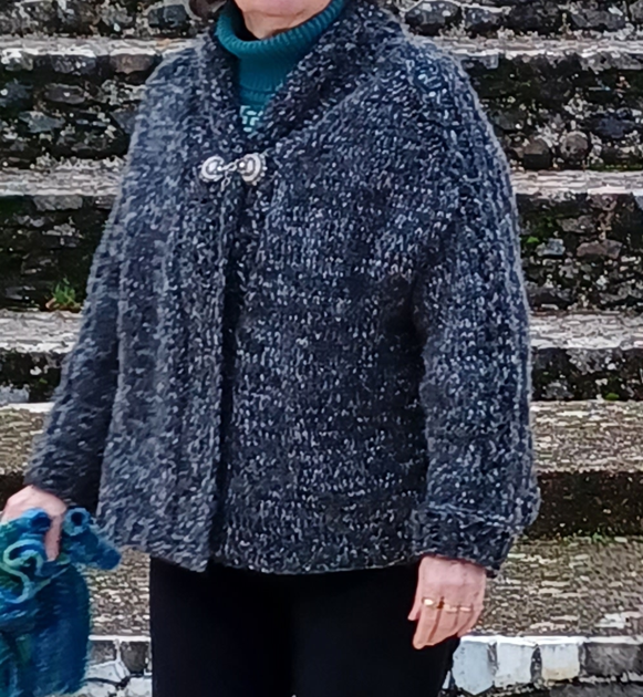 Le modèle est surdimensionné, très léger tout en étant très chaud (tricoté en laine non filée) et ouvert devant. Mais un cardigan qui ne ferme pas ne me convient pas, surtout pour l'hiver ! Donc, pour le tenir fermé, j'ai cousu une fermeture ancienne trouvée en brocante, destinée à l'origine à fermer une cape d'homme. Elle joue ici très bien son rôle. J'ai juste raccourci les manches, comme pour tous mes vêtements.