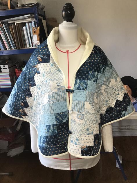 Depuis que je suis à la retraite, je couds de moins en moins de vêtements. J’ai tout ce qu’il faut, et plus de contraintes de tenues pour aller bosser. Néanmoins de temps en temps, je me donne un challenge technique (pas le cas sur ce projet, mon challenge du moment traine….). Je suis plus aujourd’hui sur le patchwork, le quilting, la broderie machine, les accessoires…Au départ, j’ai eu envie en patchwork de faire un mini quilt façon bargello. Au visuel, ça paraît compliqué, mais relativement simple à faire. J’ai cherché un projet pour l’utiliser et je suis tombée sur le Quilted Hug Project. A la base une dame a créé ce patron gratuit pour les personnes âgées en fauteuil roulant, pour protéger leurs épaules du froid. J’avais à peu près la quantité nécessaire. J’ai doublé avec un coupon de laine (un peu mangé aux mites). J’ai acheté un cadre magnétique * pour ma brodeuse, et j’ai pu faire un matelassage bord à bord (edge to edge) plutôt facilement et rapidement. Des km de biais plus tard, et 3 boutons maison, et voilà mon châle câlin. Pour être honnête, au porté, ce n’est pas top top, ni très seyant. Ça part constamment en arrière. Assis, ça va. Et c’est chaud. Bon, c’est de saison :)