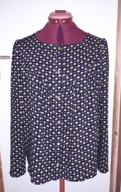 Pour utiliser un ancien coupon en viscose (?) acheté en 2016 et ainsi tenter de diminuer mon stock, je cherchais une blouse un peu ample. Qui dit ample dit Fibre Mood (enfin je trouve) et j'ai choisi le modèle Ermine du magazine n° 16/2021, qui prévoit un empiècement devant avec des fronces. Seulement lorsque j'assemblé les deux pièces, le devant haut n'était pas dans l'alignement du bas et il aurait été compliqué de coudre la patte de boutonnage. Peut-être un problème de coupe pas trop dans le droit fil pour cause de tissu très fuyant ? J'ai contrôlé la coupe du patron parce que l'angle du devant haut me paraissait improbable mais comme je ne suis pas experte en géométrie, ni en modélisme... Je n'ai pas trouvé d'autre exemple de couture de ce modèle sur le site ni ailleurs sur le net, alors je me suis débrouillée. L'emmanchure tombait bien alors j'ai ajouté un morceau sur le patron du devant haut (photo 3) et j'ai recoupé cette pièce. Le résultat est mieux mais pas parfait non plus. La patte de boutonnage a rattrapé le tout mais l'encolure baille un peu ce qui était à prévoir. Enfin, la blouse est portable, en marchant vite.