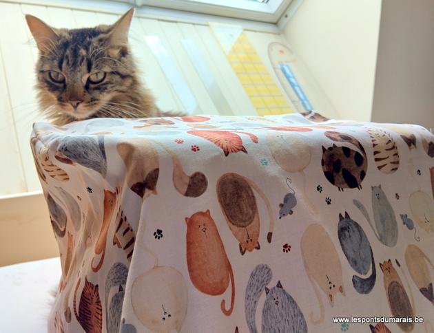 Et voilà, un petit ouvrage rapide en un après-midi, qui a drôlement plus d’allure que la housse en plastique. Il y a quelques faux plis, qui ne se voyaient pas sur la housse d’origine grâce à sa rigidité, mais tant pis. Si je modifie le modèle, je sens que je vais faire pire que mieux, n’étant pas modéliste. Le chat la trouve particulièrement à son goût, et moi aussi.
