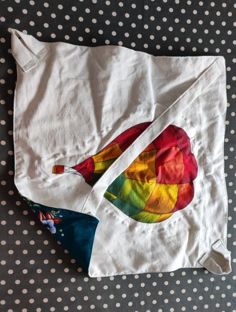- gros drap ancien épais (2 épaisseurs) avec un appliqué d'une montgolfière d'un tissu fin. Pour ces tissus, sitôt dans le le stock, sitôt cousus (en partie). J'ai cassé deux aiguilles sur les épaisseurs avec le gros drap, en cousant les lanières/poignées. Pour une prochaine fois, peut-être coudre la moitié de la largeur de la poignée en tissu fin et la moitié en tissu épais pour éviter les sur-épaisseurs.