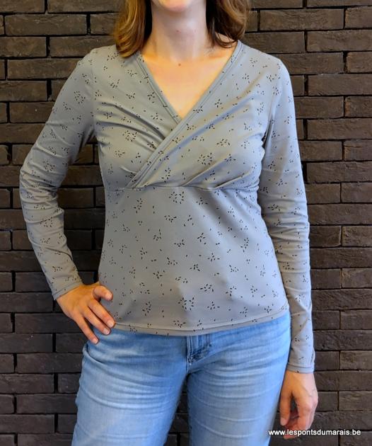 Le montage est très clair, facile et rapide avec la surjeteuse. Rien à signaler, d’autant que je l’avais déjà fait pour la robe. Et voilà, en seulement quelques heures, un petit top d’automne, confortable et plus sympa qu’un t-shirt. Seuls bémols : je trouve que la basque est un peu collante et j’ai fait la version longue, mais c’était finalement trop long. Je prendrai la version « moyenne » et peut-être un peu plus large la prochaine fois. Sinon, la partie cache-cœur est vraiment très bien. Porté au bureau, il est parfait, à la fois confortable et un peu plus original qu’un simple t-shirt. Adopté !