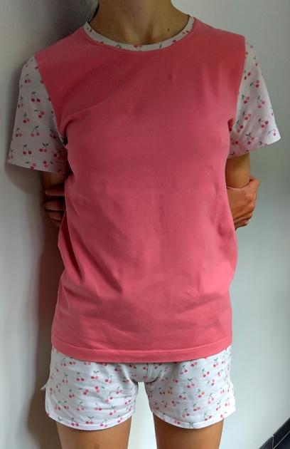 Je me suis dit qu’un short, ça rentrait. Sauf que bon, un short en jersey avec des cerises, ça fait plus pyjama. Voilà l’idée ! Je vais faire un pyjama, mais avec un t-shirt uni assorti ! Et comme j’ai même un peu trop de jersey pour le short, je vais aussi faire les manches et l’encolure dans le jersey. Maligne, hein ? Sitôt dit, sitôt fait, j’ai commandé un jersey corail assorti.