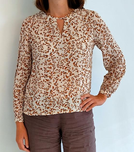 J’avais profité des soldes chez Majam pour m’offrir une box précédente. J’ai choisi une petite blouse en viscose dans les tons d’automne, qui sera parfaite pour la rentrée. Au niveau des détails, on a des manches longues légèrement bouffantes, des poignets fins fermés par un bouton et une fente indéchirable, une encolure ornée d’une petite bride et un dos fermé par trois boutons.