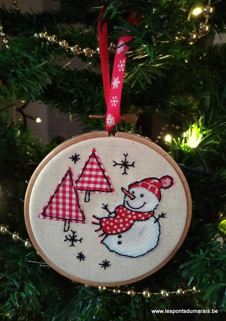 Le principe est tout simple. On découpe et thermocolle 3 morceaux de ruban sur la toile (l’un en forme de bonhomme de neige, et deux en forme de sapin), et puis on brode patiemment au point arrière tout autour des formes collées. On ajoute le ruban autour de la vis du tambour, on colle le supplément de toile à l’arrière, et c’est fini !