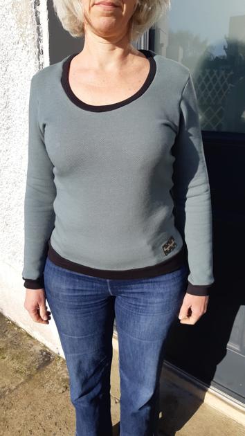 Après une première version cousu et bien porté, j'ai eu envie d'en faire une deuxième version car j'aime bien l'encolure de ce modèle. mais je voulais le faire moins court. J'ai donc rallongé de 15cm en bas et j'ai élargi au niveau de la taille de 2 cm de chaque côté. J'ai aussi fait le bas en ne restant pas sur un sweat droit mais avec une forme qui s'élargit vers les hanches.