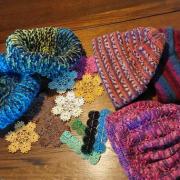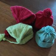 Les deux pointus avec cordon et gland sont pour deux poupettes de 5 et 7 ans, et les deux bonnets ronds à pompon sont pour deux petits gars de 5 ans et 21 mois.