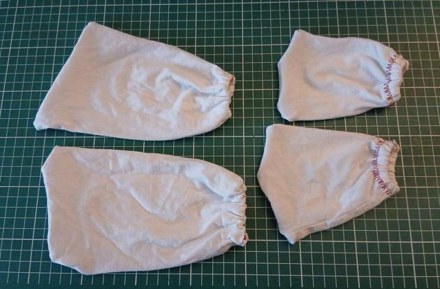 Deux manches de t-shirt 100% coton mis au recyclage, coupées en 2, et voici deux paires de pseudo-gants pour limiter le grattage nocturne. L'élastique est passé directement dans l'ourlet de manche pour la version la plus grande, et l'ourlet a été replié et recousu sur les petits pour passer de l'élastique-de-chez-Emmaüs (il va y avoir beaucoup de projets avec ces deux bobines d'élastiques). C'est moche, autant que l'araignée en tissu gris poilu pour réparer le jogging Spiderman troué que je ne posterai pas, mais avec un peu de chance ça limitera la consommation de scotch médical pour protéger les griffes de mes deux monstres et ils sont ravis de leurs nouvelles acquisitions.