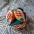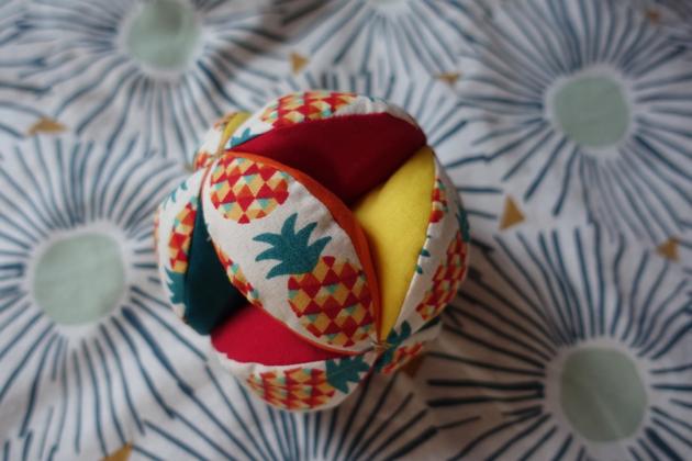 C'est une affaire de patience : 24 quarts de cercle et 12 éllipses à découper, 12 quartiers à assembler, rembourrer, fermer puis fixer solidement les uns aux autres. J'avais dans mes chutes suffisamment de coton aux ananas pour les ellipses, ainsi que des cotons unis parfaitement assortis. Une réunion en visio et deux petites soirées télé m'ont suffi pour la couture à la main (qui n'est pas ma tasse de thé). Le bébé lui a à peine jeté un coup d'œil (tout occupé à son rôle de chef d'orchestre d'un auditoire familial sous le charme) mais le papa a apprécié le caractère silencieux du jeu !