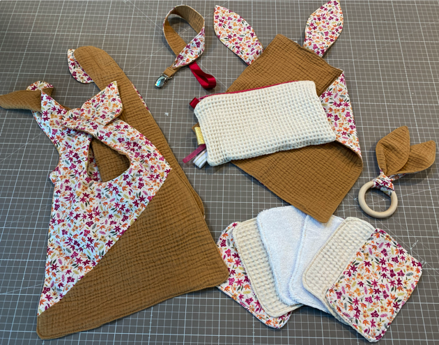 Trousseau de naissance pour une petite fille sur le point d'arriver ! Anneau de dentition, doudou à mâchouiller, set de débarbouillettes avec trousse, attache-sucette et bavoirs. J'espère que ça plaira aux futurs parents.