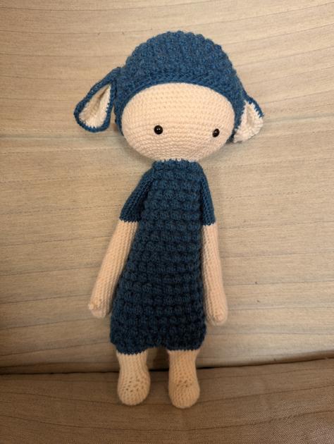 J’ai repris plusieurs mois plus tard et de fil en aiguille, des projets qui passent avant, Lupo a traîné encore et encore, une tête, une capuche quelques mois après, les bras encore plus tard,,, mais les oreilles ont enfin été cousues sur la capuche ce jour !!