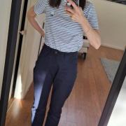 La taille est plus basse que ce que je porte d'habitude, mais pas trop basse non plus. En revanche ils n'est pas très long et rend mieux sans chaussettes avec des baskets basses ou des petites chaussures plus printanières que mes godillots de neige canadiens. En tout cas je me suis bien amusée à le faire, même si idéalement il faudrait deux machines, une pour les coutures et une pour les surpiqûres. Ici, j'ai tout fait avec le même fil pour éviter de changer de bobine toutes les 5 mintues.