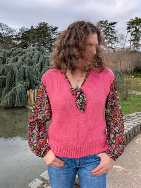 Pour aller avec ma blouse Monarch, j’ai tricoté un slipover – en français un pull sans manche, toujours de la même créatrice avec une laine qui vient de chez elle. Les deux se marient parfaitement et même si ce rose n’est clairement pas dans mes couleurs habituelles il se marie avec plusieurs haut ou bas de ma garde-robe.