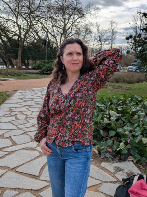 Blouse taillée en 40. Elle est ample juste ce qu’il faut, je ne suis pas engoncée au niveau de la carrure et des bras comme bien souvent et tombe parfaitement au niveau du buste.