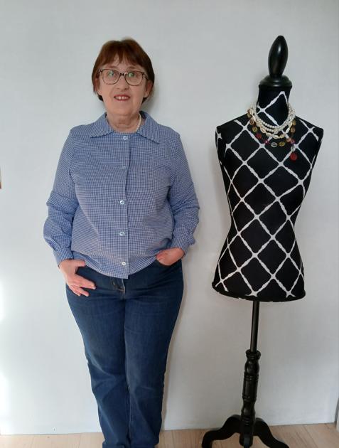 Voici une 3eme chemise Burda Easy 01/2025 dans un tres beau coton vichy bleu et blanc de chez Eyrelles Tissus