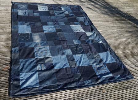 Mon Grand a flashé un jour dans un magasin de couture sur un tissu doudou “Oh, je voudrais trop une couverture comme ça!” J’ai gardé ça dans un coin de ma tête. Pour son 17ème anniversaire, j’ai donc réutilisé tous les vieux jeans de la famille gardés dans ce but, pour une face patchwork que j’ai bien sûr doublée avec le doudou de Mondial Tissu. Il était ravi, adore les poches et s’enroule dedans dès que possible (ce qui explique le coté froissé sur les photos ;-) )