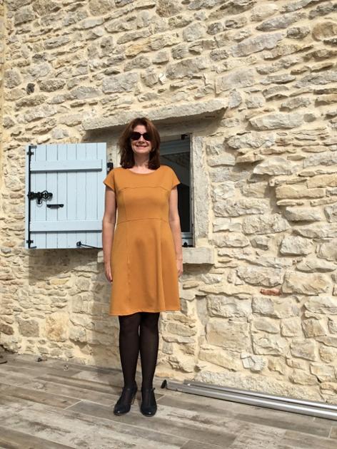 Robe Madeline, La Maison Victor Sept/Oct 2017, en jersey Milano moutarde Ma Petite Mercerie