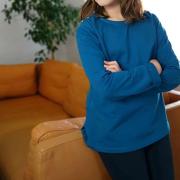 C'est un bon basique de sweat pour femme (cousu 2 fois pour moi) mais aussi pour ado. Petite custo avec un volant grâce à un tuto du net (merci la blogo). J'ai rajouté une petite broderie tout en bas, ce sera ma minuscule participation au concours Double fil de T&N si je n'ai pas le temps de faire mieux, juste pour le fun ! Le V du sweat n'est pas parfait mais j'ai fait au mieux avec cette épaisseur.