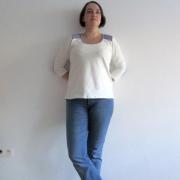 Pour la deuxième technique, je suis partie dans une déco/broderie machine/appliqué inverse/Alabama Chanin/grosse bidouille nuageuse sur les épaules et le dos. J'ai fait du ton sur ton mais comme l'envers du jersey apparait là où j'ai coupé, on voit quand même une petite différence de couleur selon la lumière. Je trouve le résultat très sympa mais qu’est ce que c’était long !!! (et là, j’admire celles qui se lancent dans la broderie à la main, la couture de perles…etc. j’avoue que je ne pense pas que j’aurai fait ça sans la motivation du concours…)