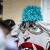A la base un tisch texturé beige doré de seconde main, un bonnet polonais cousu dans l'encolure pour les cheveux, du galon de vide-grenier pour les cils, peinture acrylique et poscas pour les grands yeux, morceau de soquette pour le nez, collant filé pour les lèvres, dents en plaque de mousse fine, mousse fine dans les oreilles qui sont constituées par les manches et finalement aussi un reste de gaine en mousse récupéré in extremis pour que lesdites oreilles ne tombe pas tristement et que mon ogresse ouvre une belle gueule à tout vent !