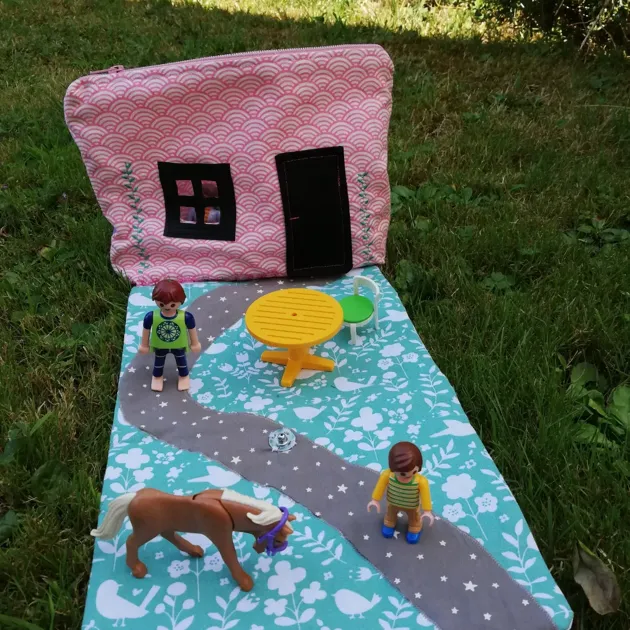 Pour les vacances cette année, nous sommes partis dans le sud de la France (nous habitons en Île de France) et j'appréhendais un peu le loooong trajet avec les enfants (4 et 9 ans). Comme les deux demoiselles s'entendent bien pour jouer aux Playmobils, j'ai imaginé une trousse qui s'adapterait sur l'accoudoir de la voiture et qui leur permettrait de s'amuser pendant le voyage, et pendant le séjour.